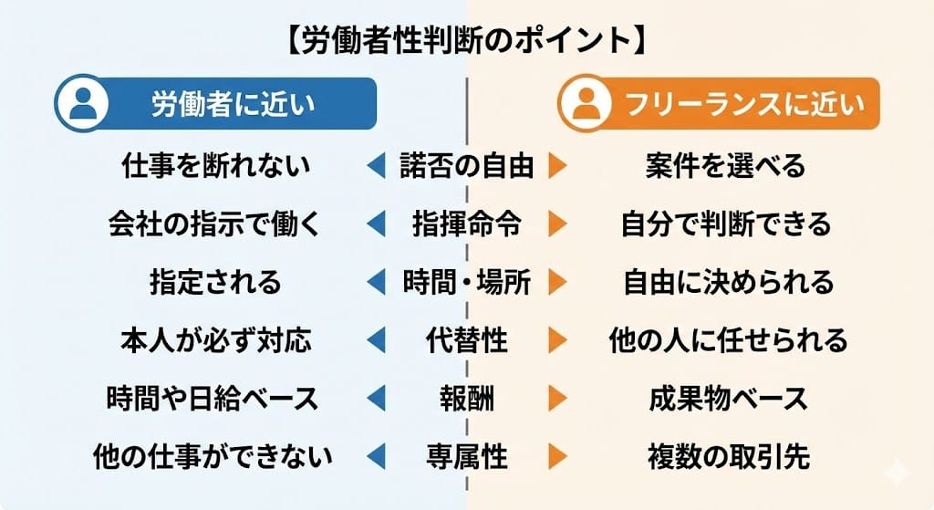 といった要素が強い場合、契約書上は「業務委託」「フリーランス」と書かれていても、実態として労働者に近いと判断される可能性が高まります。