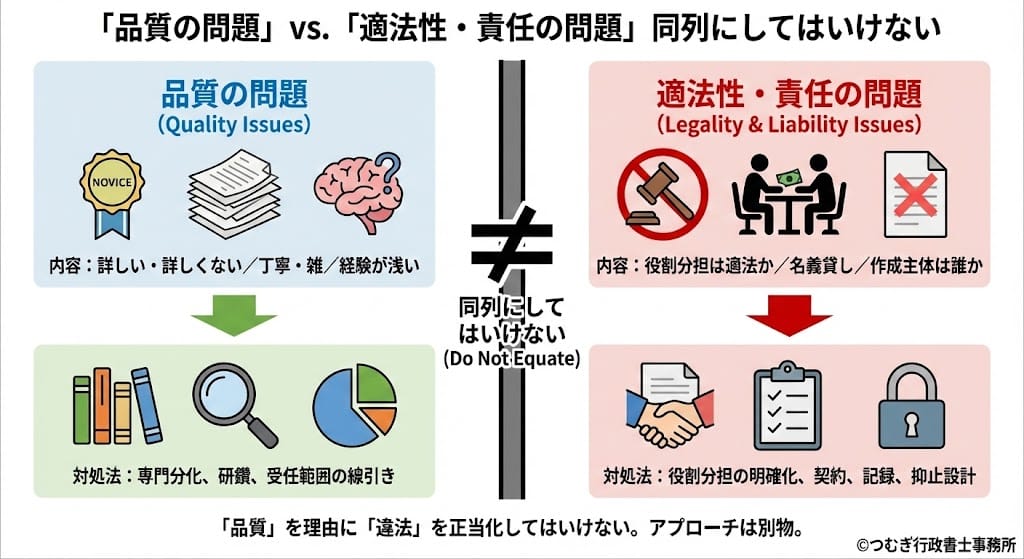 しかし、それと「名目を変えた対価で無資格者が実質的に書類作成を行う」とか「だからこそ無資格だけど業界に精通してるコンサル会社は必要悪なんだ」といった“適法性・責任の話”は、同列ではありません。ここを同列に語ってしまうと、品質問題を理由に適法性問題が正当化されるような、危うい議論になりやすいからです。