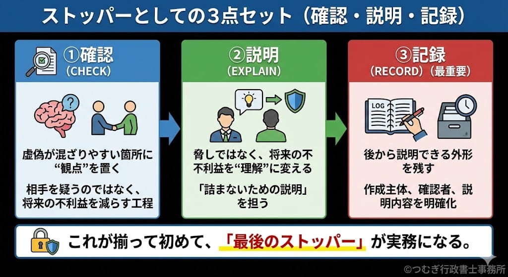 行政書士が制度のストッパーとして機能するためのポイントは3つだけです。「確認」「説明」「記録」です。
