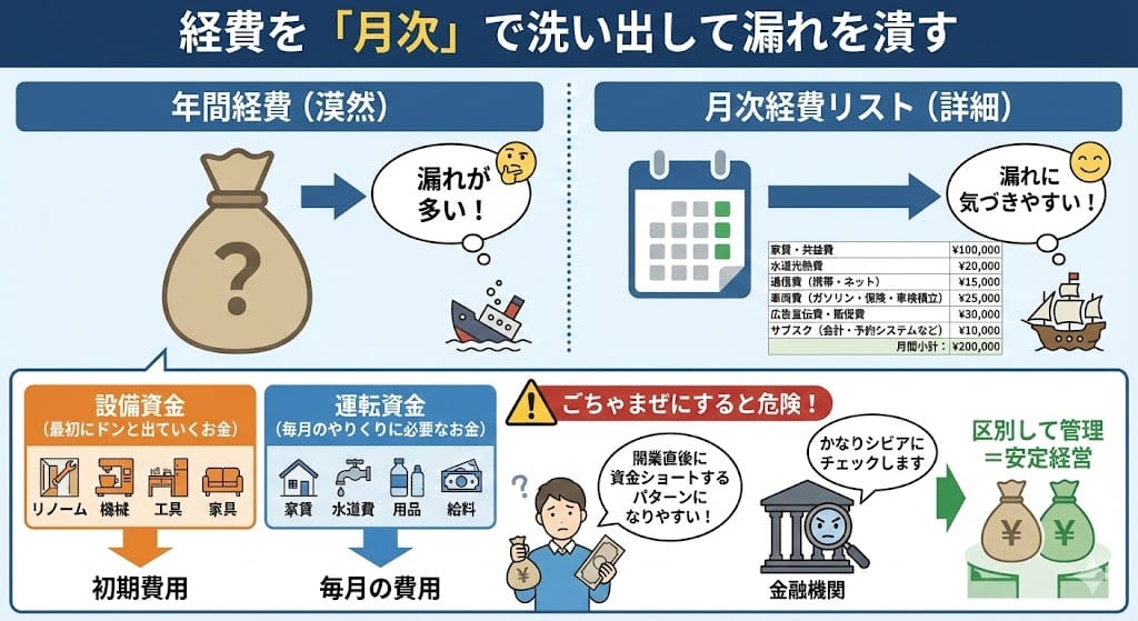 - 設備資金と運転資金を分け、3〜6か月分の運転資金を意識する