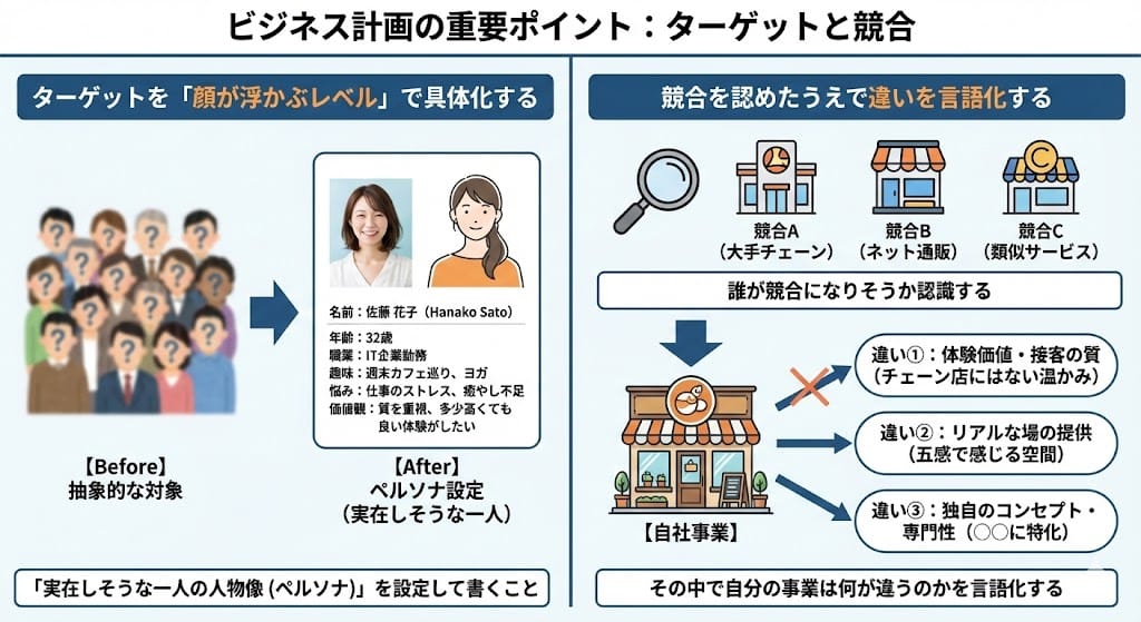 競合がまったくいない市場は、むしろ稀です。金融機関も「競合ゼロ」と書かれていると逆に不安に感じます。