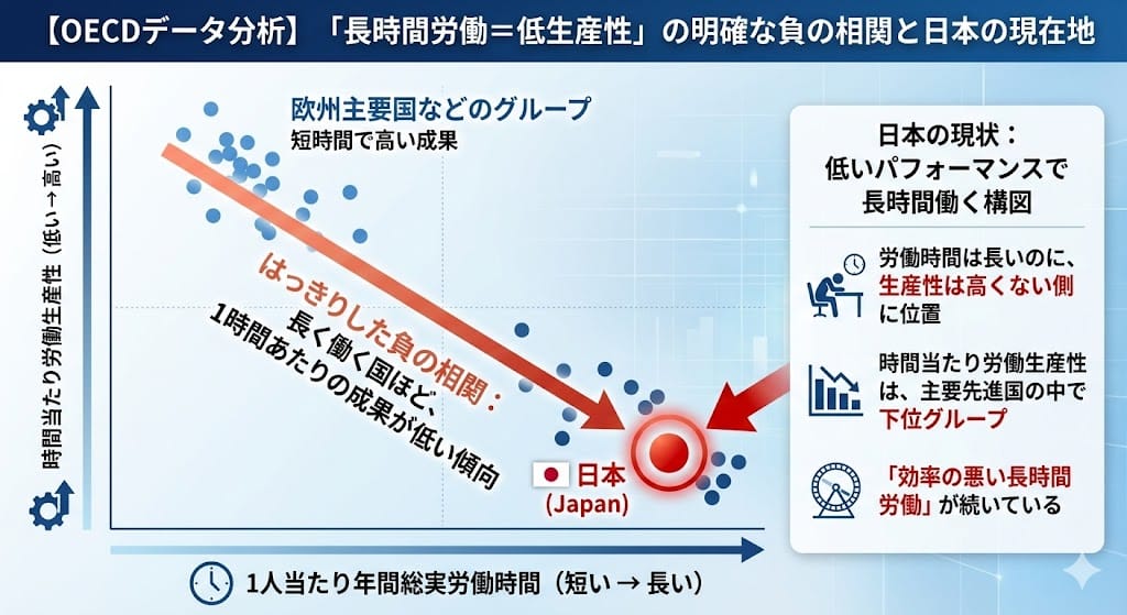 • 「長く働く国」ほど「1時間あたりの成果が低い」傾向がある